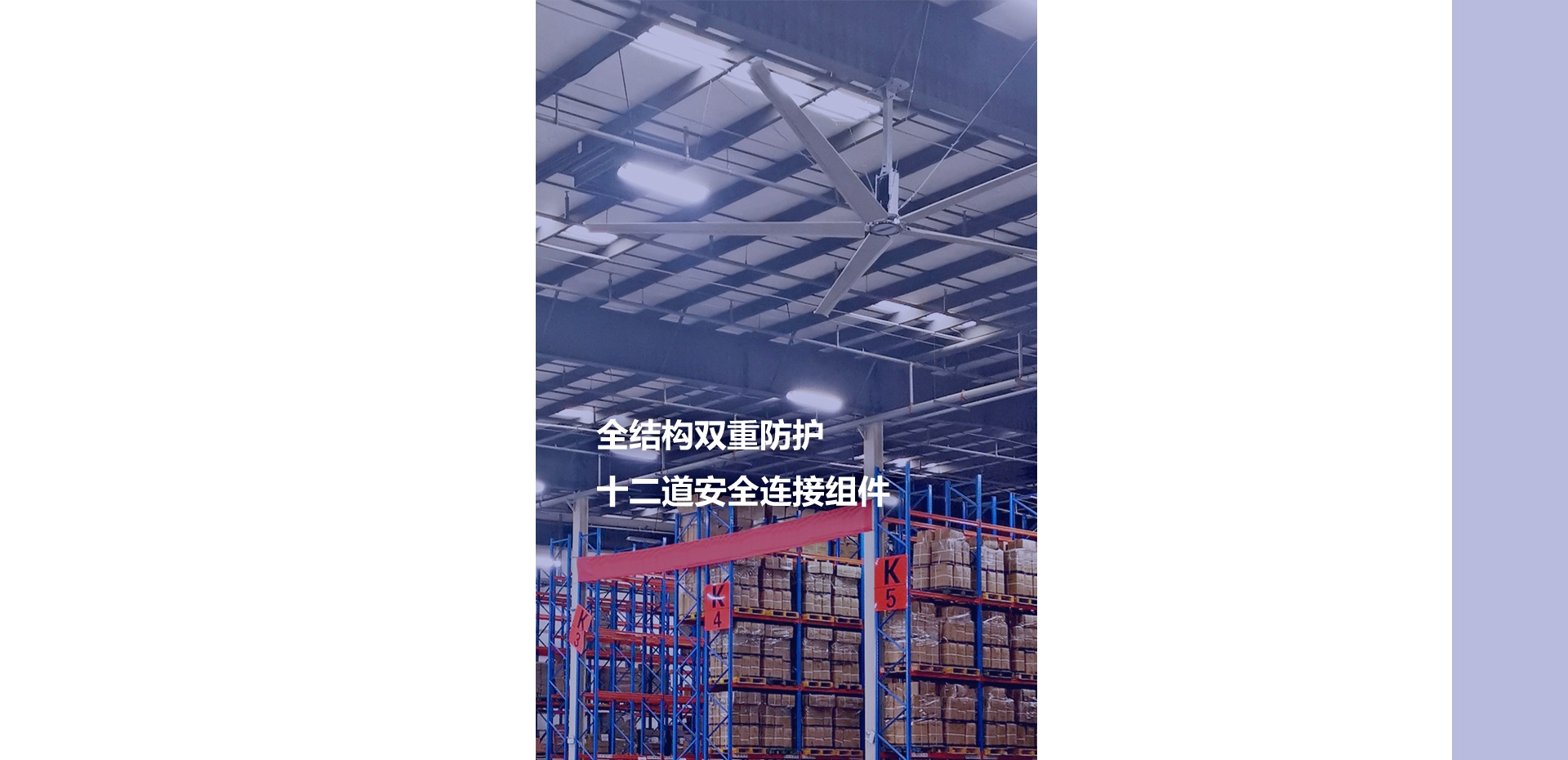 物流倉庫使用大型工業(yè)吊扇,能促進(jìn)整個(gè)空間內(nèi)外空氣流通,解決悶熱,平衡空氣濕度,有效避免其它通風(fēng)方案的局限性(安全及能耗),改善工作環(huán)境。